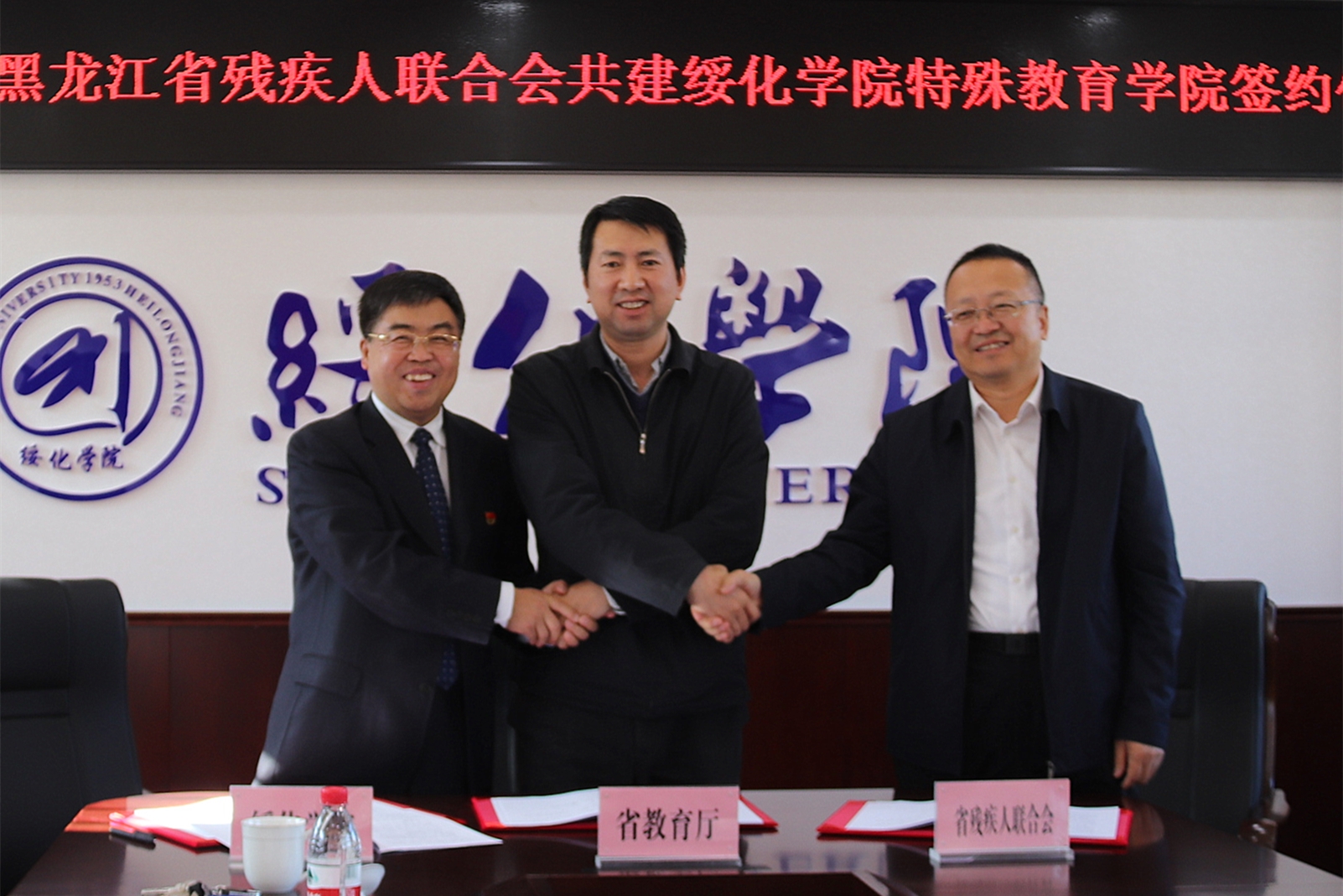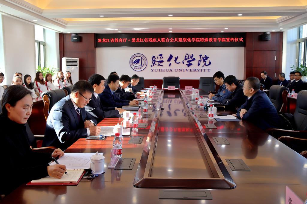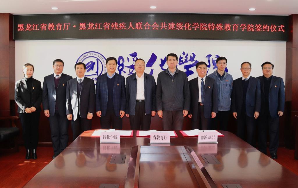 赵广、王传文、张凤武在分别代表省教育厅、省残联、绥化学院在“省教育厅、省残联共建绥化学院特殊教育学院框架协议”上签字。签约仪式由校长张凤武主持。