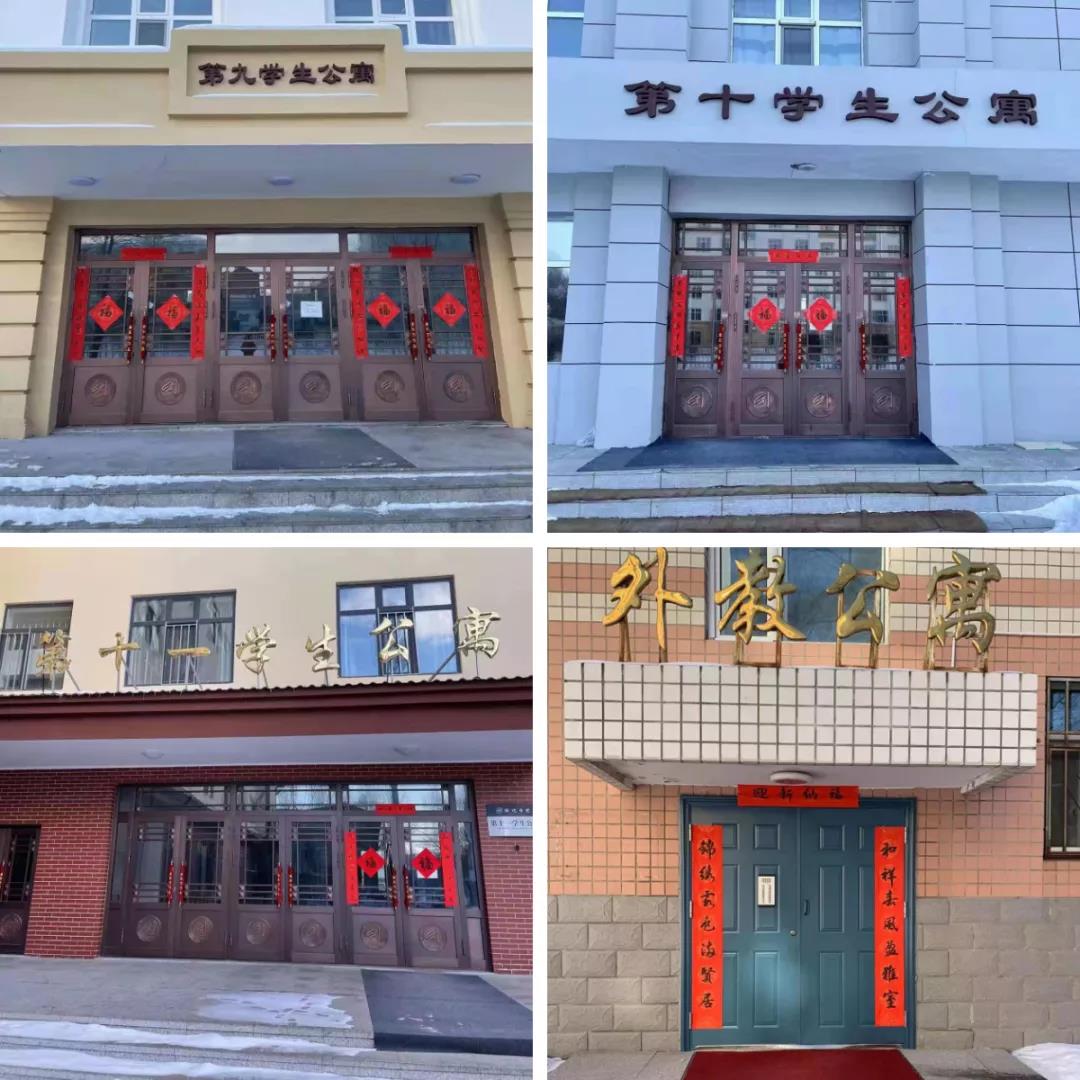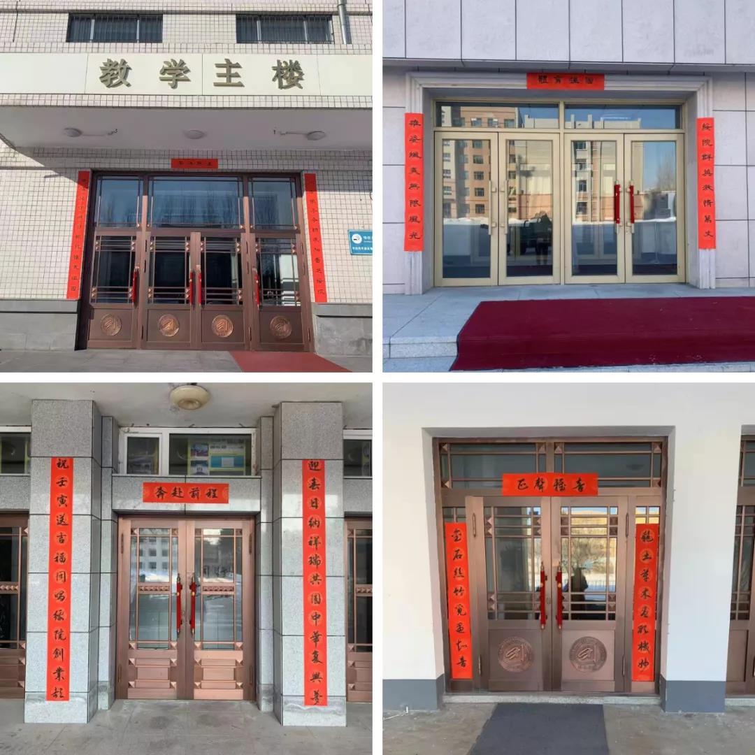 在宣传统战部牵头策划下,文学与传媒学院教师结合楼宇功能、传统文化和学校的办学亮点撰写了春联内容,工会副主席白景军题写了学校东西侧校门、全校办公楼宇和教学楼的春联,后勤管理处和物业公司负责布置张贴春联。学生工作部(处)也在学生公寓张贴了春联,表达对学子的殷切希望。