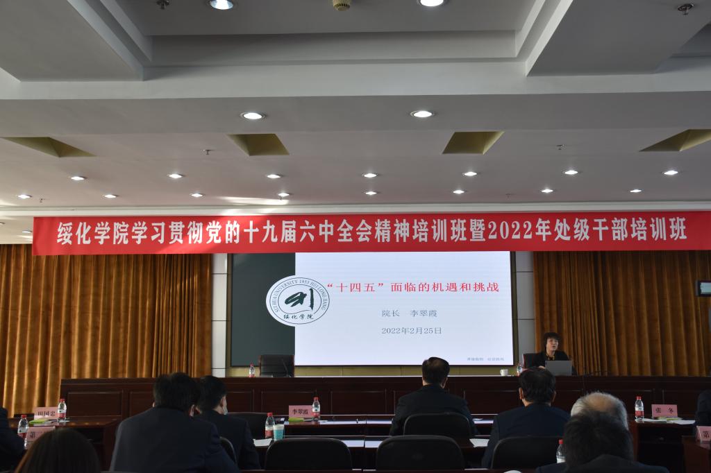 李翠霞围绕学校“十四五”面临的机遇和挑战作专题辅导。从发展的目标任务、现实基础和面临问题、机遇和挑战、思路和举措等方面分析了“十四五”期间学校面临的形势和任务。党委副书记张冬,副校长田国忠,纪委书记、省监委驻绥化学院监察专员陈玉平围绕各自分管工作和学校实际作了专题培训。