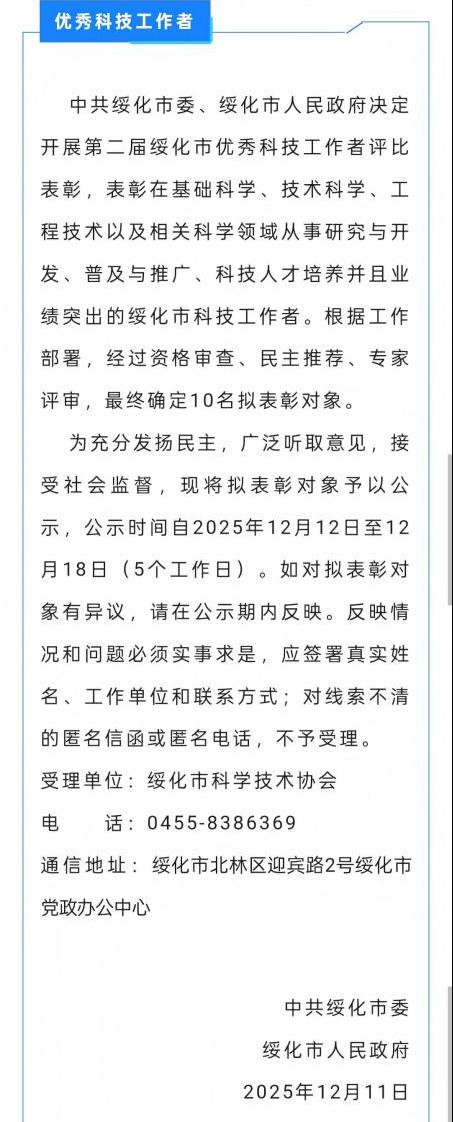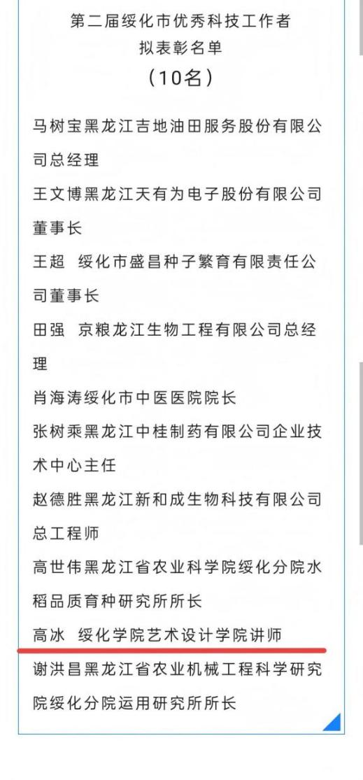 近日,中共绥化市委、绥化市人民政府开展第二届绥化市优秀科技工作者评比,表彰在基础科学、技术科学、工程技术以及相关科学领域从事研究与开发、普及与推广、科技人才培养并且业绩突出的绥化市科技工作者。我校艺术设计学院教师高冰荣获“绥化市优秀科技工作者”荣誉称号。