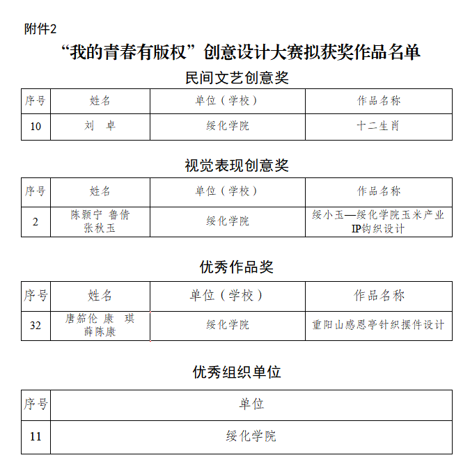 自大赛启动以来,学校高度、精心组织,各学院积极响应,师生们踊跃参与、潜心创作,围绕赛事主题深度挖掘龙江地域民间文艺元素,将非遗技艺、民俗文化与现代设计理念相融合,共报送产品设计、平面设计、新媒体设计等各类参赛作品60余件,作品涵盖文创产品、IP形象设计、手工工艺品等多个领域,内容丰富、创意鲜明,充分展现了我校师生的文化素养与创新活力。经过多轮评选,最终刘卓教师《十二生肖》荣获民间文艺创意奖,陈颢宁、鲁倩、张秋玉同学的《绥小玉-绥化学院玉米产业IP钩织设计》荣获视觉表现创意奖,唐笳伦、康琪、薛陈康同学的《重阳山感恩亭针织摆件设计》荣获优秀作品奖,多件作品得到评审专家的高度认可。此次学校获“优秀组织奖”及多项作品获奖,是大赛主办方对我校赛事组织工作的充分肯定,是各部门协同合作,密切配合的结果。下一步,学校将继续高度重视文化创意领域的人才培养与实践创新,持续搭建优质平台,不断提升师生的版权保护意识与创意实践能力,为地域文化传承发展与文化产业升级贡献更多绥院力量,创造更多绥院品牌。