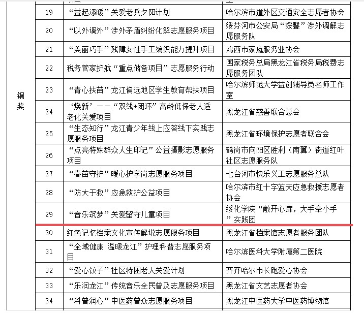 近日,由省委社会工作部、省委宣传部(省文明办)组织开展的“第四届黑龙江省新时代文明实践志愿服务项目大赛”落下帷幕,我校推荐的“音乐筑梦”关爱留守儿童项目荣获铜奖。