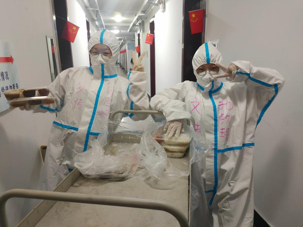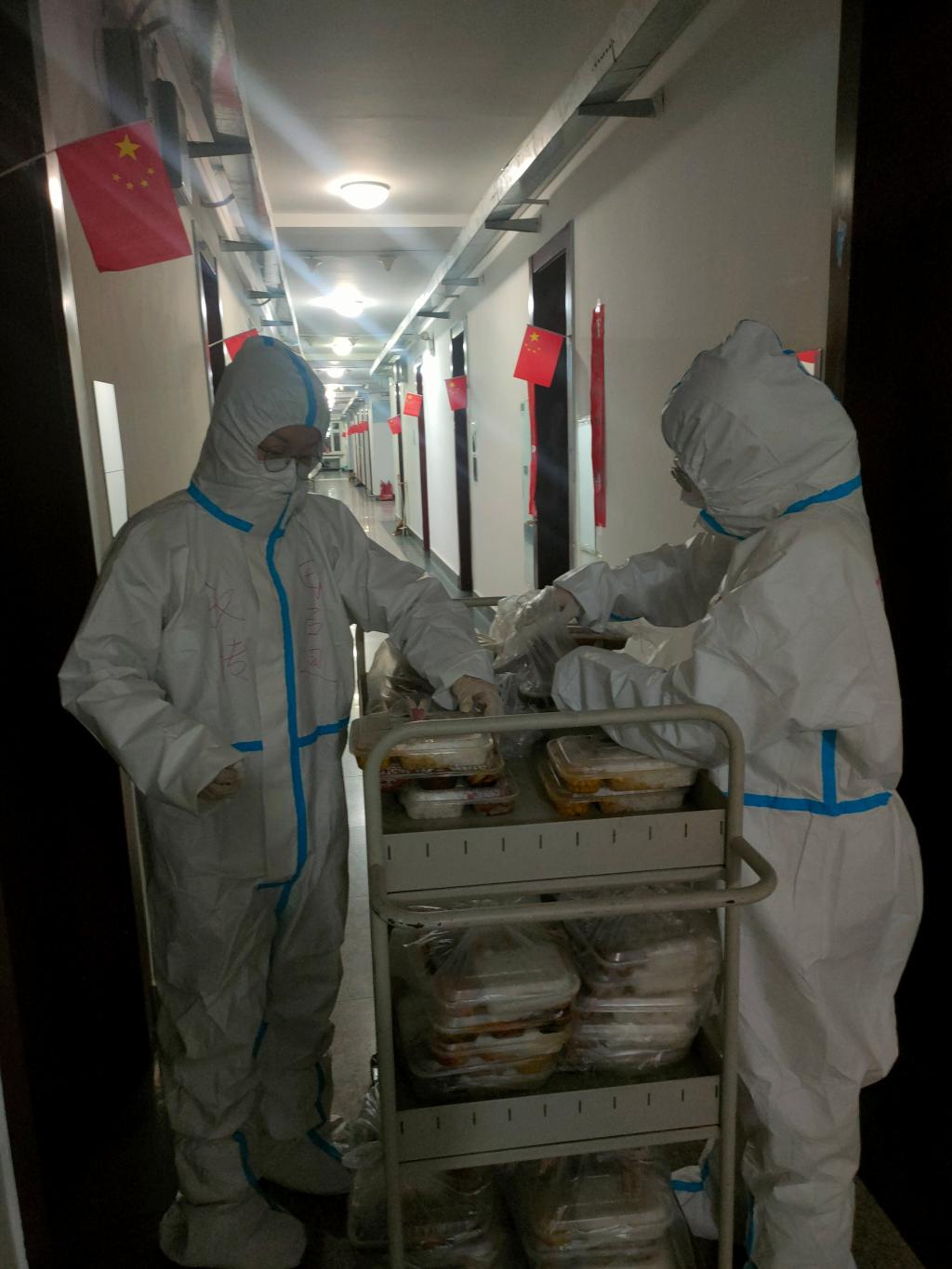 “知道征集学生志愿者,没有过多考虑就报了名。战胜疫情需要大家的努力,没有一个人可以独善其身,偏安一隅。”2019级计算机科学与技术专业学生党员任仰瑞说。任仰瑞负责第十一学生公寓二楼近30个寝室、110人,最开始整个二楼只有他一名志愿者,每顿饭需要把100多个人的餐从一楼搬到二楼,一次拿不了那么多,就来回上下楼拎,再放到小推车上,按名单放到每个寝室的门口。因为穿防护服,每次发完餐浑身都是湿透的,他说之前只是在电视上看到医护人员穿防护服的模样,自己经历过才知道有多不容易。