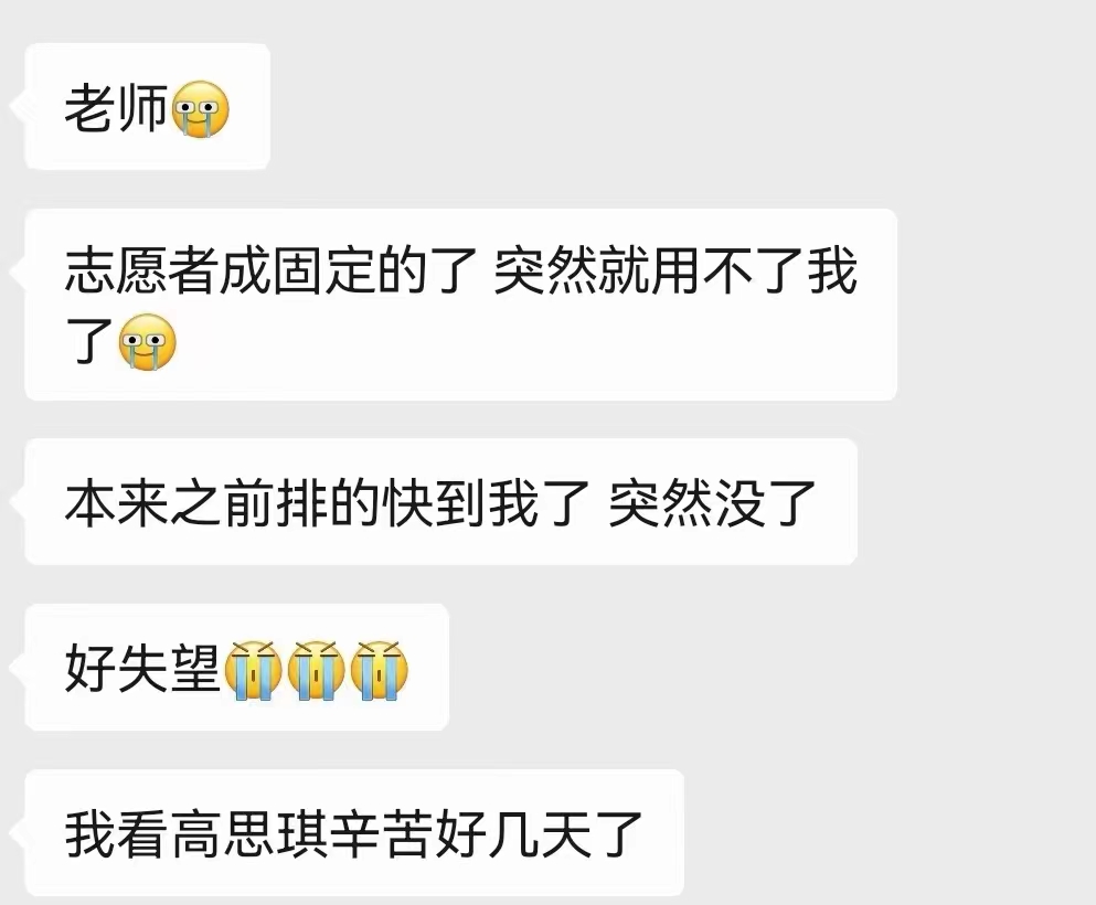 “老师,志愿者成固定的了,突然就不用我了,本来之前排的快到我了,突然没了,好失望,我看高思琪辛苦好几天了。”