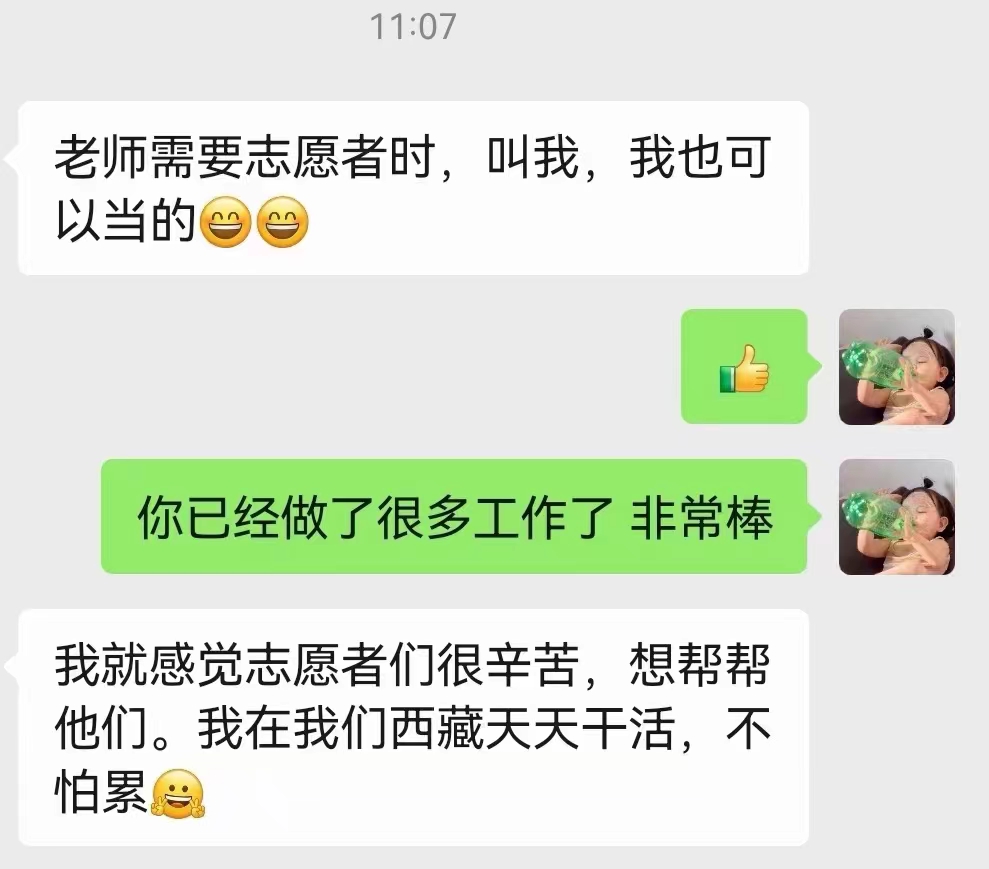 “老师,需要志愿者时叫我,我也可以当的。志愿者们都很辛苦,我想帮帮他们。我在我们西藏天天干活,不怕累。”