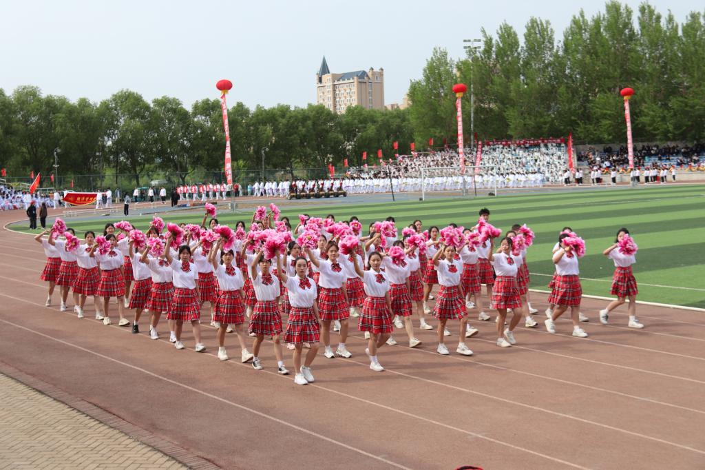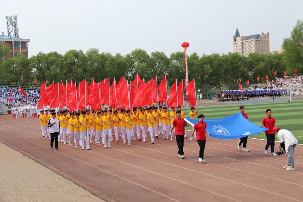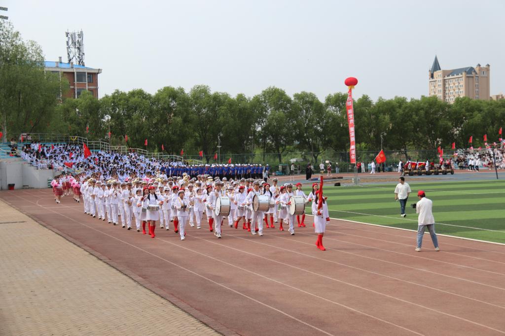 当激昂奋进的《运动员进行曲》在体育场上空响起,朝气蓬勃的国旗护卫队踏着铿锵有力、整齐划一的步伐向主席台走来,军乐队、花束队、刀旗队、裁判员方队、各二级学院方队和离退休职工、图书馆、党政机关、后勤管理处等代表队紧随其后,各方阵各具特色,个性鲜明,他们身着整齐的服装,喊着嘹亮的口号,迈着矫健的步伐,依次入场,接受检阅。