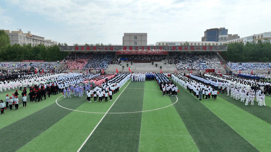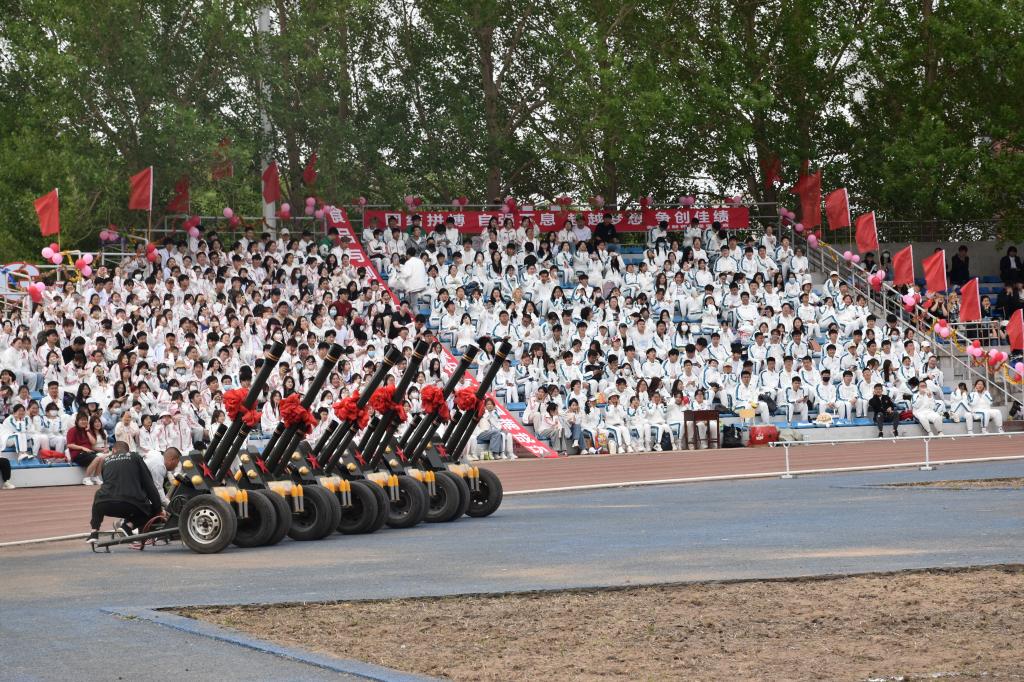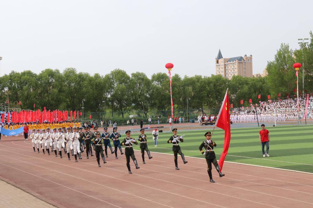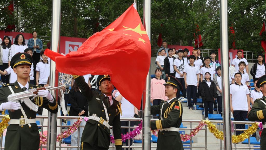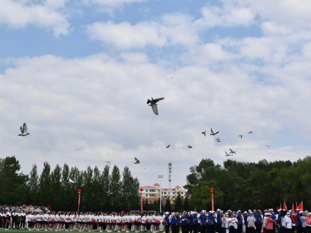 庄严的《义勇军进行曲》响起,全体师生肃然起立,齐声唱响国歌,注视着五星红旗冉冉升起,运动场上空放飞和平鸽,鸣放礼炮。