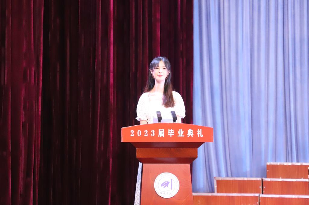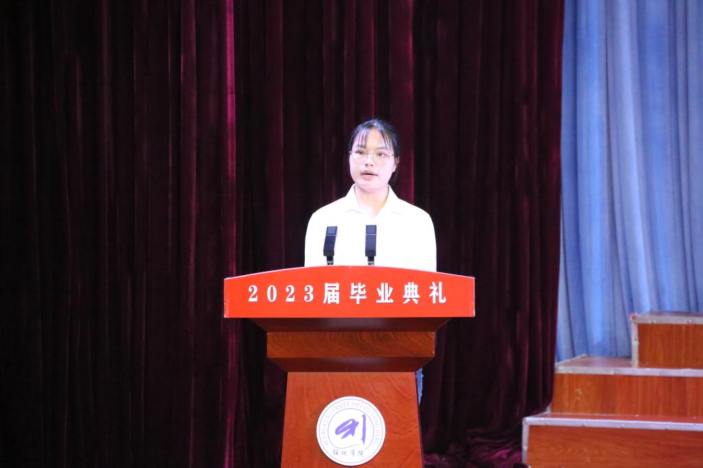电气工程学院2022级电子信息工程专业学生王奕菲代表在校生发言。她向即将离开母校的师哥师姐们表达了最衷心的祝愿和感谢,并作出承诺:“我们会秉承‘厚德载物、经世致用’的校训,用青春与智慧承继辉煌,续写绥化学院新的辉煌篇章。”