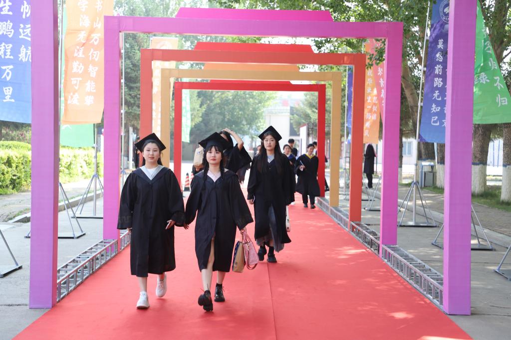 我校2023届毕业生穿过分别写有“四载春华秋实,一往母校情深”“自信人生二百年,会当水击三千里”“释放青春激情,追逐青春理想”“志当存高远,无愧梦少年”“让青春在党和人民最需要的地方绽放绚丽之花”祝福的五道彩虹门,走进毕业典礼现场。