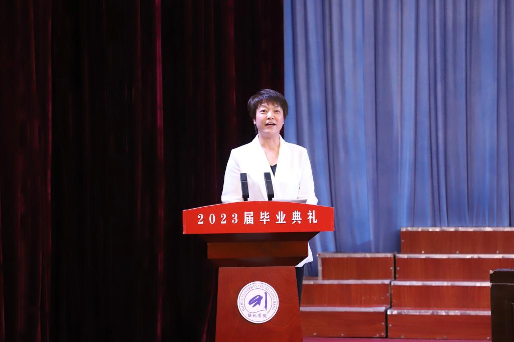李翠霞向2023届毕业生表示祝贺,回顾了同学们四年来取得的成绩。她希望同学们有理想,努力做胸怀家国的奉献者;敢担当,努力做永立潮头的开拓者;能吃苦,努力做笃行不怠的实干者;肯奋斗,努力做矢志拼搏的奋进者。