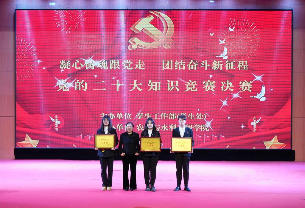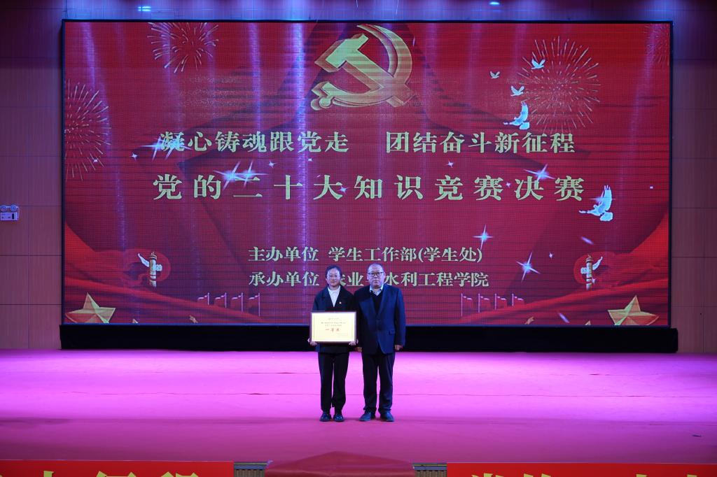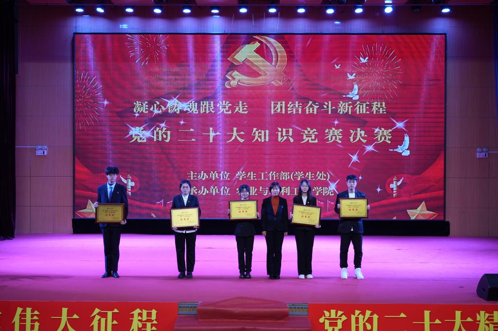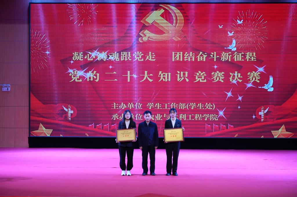 为深入学习贯彻习近平新时代中国特色社会主义思想,持续推动学习贯彻党的二十大精神走深走实,引导青年学生坚定信念、牢记嘱托,争做有理想、敢担当、能吃苦、肯奋斗的新时代好青年,12月13日,由学生工作部主办、农业与水利工程学院承办的“凝心铸魂跟党走 团结奋斗新征程”党的二十大知识竞赛决赛在大学生活动中心举行。学校党委书记刘峰,党委委员、副院长卢百胜,党委委员、党委宣传统战部部长刘鹏程,办公室主任马国齐,学生工作部部长关江宏,农业与水利工程学院党总支书记吕霞,部分二级学院辅导员、学生代表现场观摩比赛。