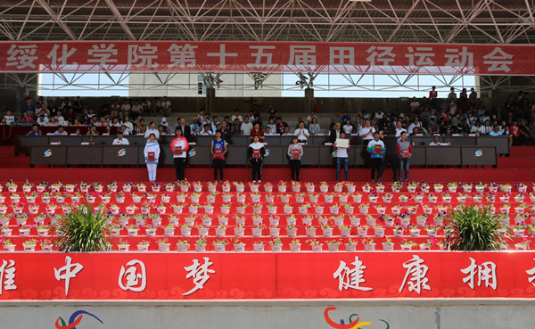伴随着激昂的《运动员进行曲》,学校体育运动委员会副主任、运动会总裁判长门彦阁宣布第十五届田径运动会竞赛成绩。电气工程学院、文学与传媒学院、信息工程学院获得学生男子团体前三名;经济管理学院、艺术设计学院、电气工程学院获得学生女子团体前三名;电气工程学院、经济管理学院、文学与传媒学院获得学生男女团体总分前三名;机关党群分工会、机关行政分工会、农业与水利工程学院分工会获得教工团体总分前三名。纪委书记田国忠宣布图书馆分工会、思想政治理论课教研部分工会、外国语学院分工会、教育学院分工会、信息工程学院分工会、文学与传媒学院分工会、食品与制药工程学院分工会、农业与水利工程学院分工会、经济管理学院分工会、艺术设计学院分工会、电气工程学院分工会、音乐学院分工会、体育系分工会获教工组体育道德风尚奖;经济管理学院、食品与制药工程学院、外国语学院、文学与传媒学院、教育学院、信息工程学院、农业与水利工程学院、艺术设计学院获学生组体育道德风尚奖;音乐学院、电气工程学院、体育系获特别贡献奖;电气工程学院、经济管理学院、农业与水利工程学院、信息工程学院、文学与传媒学院获广播体操比赛一等奖,教育学院、外国语学院、艺术设计学院、食品与制药工程学院获得二等奖。随后,学校领导为获奖团体和个人颁奖。