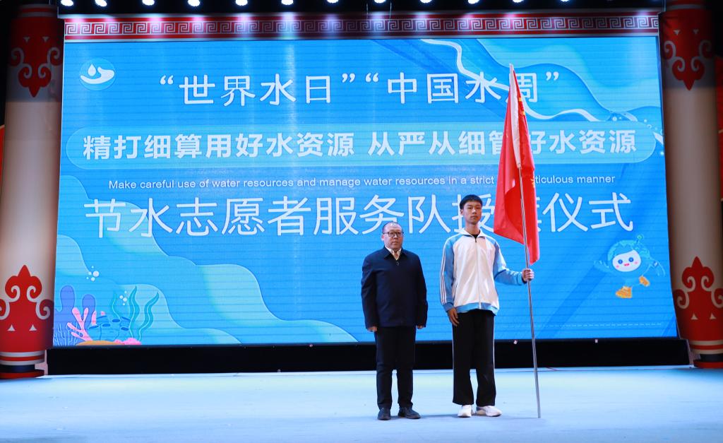 卢百胜为节水志愿者服务队授旗。