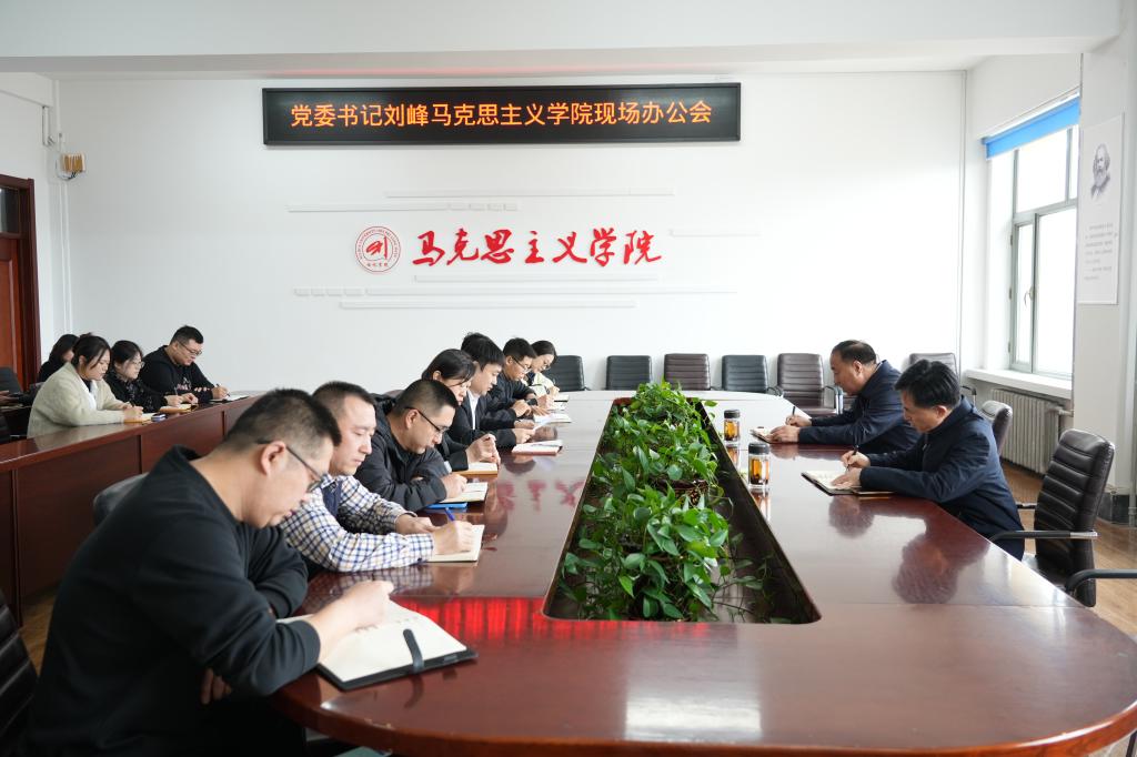刘峰强调,要进一步找差距、补短板、强弱项,主动走出去,向省内外马克思主义学院建设先进单位学习经验方法,研究解决学院发展过程中存在的难点堵点问题,着力加强学院标准化建设。加强学院名师工作室建设,聚集优势资源打造一流教研团队。持续深化实践教学能力提升,逐步构建有特色的思想政治理论课实践教学体系,着力强化思政育人实效。要自觉增强深入贯彻中央八项规定精神学习教育的责任感紧迫感,精心组织实施,在推动学校高质量发展、加强学院治理、完成急难险重任务中担当作为、服务师生,让师生可感可及。