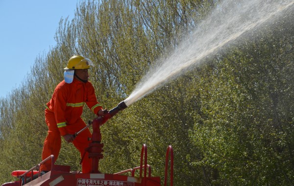 5月9日14时许,实验楼浓烟四起,“失火了”,紧接着,刺耳的警铃声在校园上空迅速响起。“俯身走,捂好口鼻!”“靠右侧,靠右侧”,在消防指挥员的指挥下,师生循序有序撤离。此时,消防车闻讯赶到,消防员打开消防栓,拧上高压水枪,登上消防车顶,放开消防水炮,对准起火点喷水。掌声响起,5分钟内演习结束。
