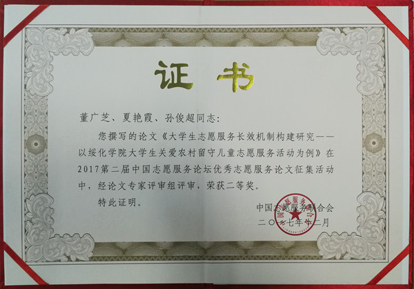近日,中国志愿服务联合会印发《关于中国志愿服务优秀论文评选结果的通报》,我校报送的由党委书记董广芝、团委书记夏艳霞、学生工作部(处)孙俊超共同撰写的论文《大学生志愿服务长效机制构建研究——以绥化学院大学生关爱农村留守儿童志愿服务活动为例》喜获二等奖。