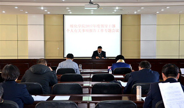 1月6日上午,我校召开2018年领导干部个人有关事项报告工作专题会议,部署我校2017年度领导干部报告个人有关事项填报工作。党委书记董广芝、校长张凤武、党委副书记张宝军,副校长田军、李春雨、孙庆平,纪委书记田国忠,副校长王东、工会主席李淑慧出席会议,全校副处级以上干部参加会议。会议由党委委员、组织部部长唐玉蛟主持。