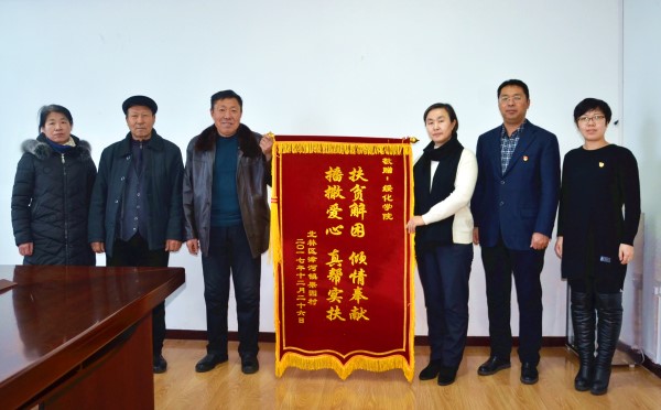 12月26日,我校精准帮扶对口扶贫对象果园村村委会班子成员一行4人,代表全村将一面印有“扶贫解困 倾情奉献 播撒爱心 真帮实扶”的锦旗送予我校,表达果园村对我校精准扶贫工作的诚挚感谢。工会主席李淑慧,党委委员、组织部部长唐玉蛟代表学校接受锦旗。(记者 张志豪 杜鑫妍)