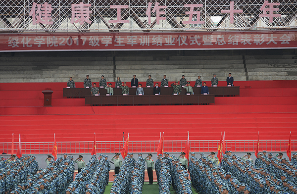 , 2017级学生军训结业仪式暨总结表彰大会在体育场隆重举行。绥化武警支队支队长曹旭东上校,政治部主任王晓东中校,学校领导董广芝、张凤武、田军、孙庆平以及教务处处长、各院系党总支书记出席会议。大会由学生工作部(处)长、武装部部长、军训团政治处主任白景军主持。