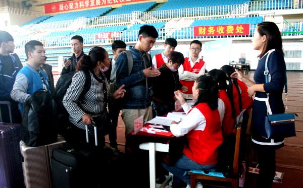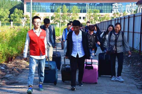 9月2日6点,2016级特殊教育专业的于晶莹便早早起床,吃过早餐后立即奔向火车站,迎接从3000公里外的广西桂林赶来学校报到的听障新生曾烨。经过半个小时的等待,于晶莹终于见到了与她对接的听障新生曾烨和她的父亲。于晶莹连忙接过曾烨手中的行李,他们从火车站向学校体育馆赶去。一路上,于晶莹与曾烨和她的父亲聊家常、嘘寒问暖,向她们介绍入学后的注意事项。从信息登记、寝室分配再到领取饭卡,直至缴纳完学费,于晶莹终于有了喘口气的机会。据于晶莹介绍说:“早在暑期就通过QQ和微信已经和曾烨取得了联系,今天接到他们的电话后,我就立刻赶来火车站与曾烨对接。一会儿还要带他们去新校区领取被褥和宿舍钥匙”。