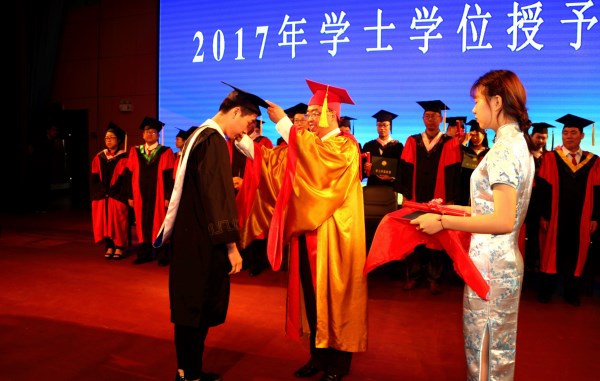 毕业典礼结束后,学位委员会主席、校长张凤武和各院系负责人为获得学士学位的同学行拨穗正冠礼并颁发学士学位证书。(记者 张睿楠 汪 冉 战美洁)