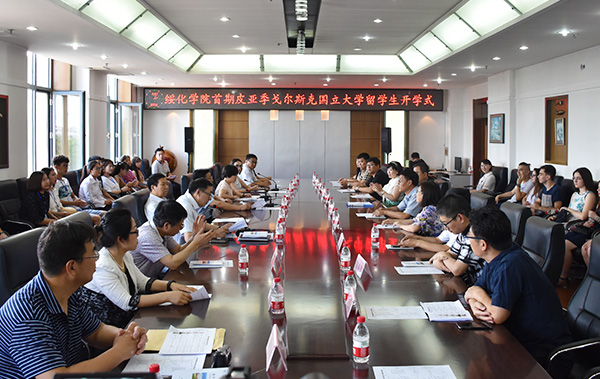 6月25日,学校首届留学生开学式在教学主楼会议室举行。党委副书记张宝军,副校长田军,教务处处长赵东江、副处长卞兴超,学生工作部(处)长白景军,团委书记夏艳霞,对外交流合作处处长周全、副处长康俊偈,保卫处处长李伟,文学与传媒学院党总支书记逯鸿友、院长高文利、党总支副书记侯国锋、副院长高岩、由婧涵,外国语学院党总支书记李为民、副院长刘静,艺术与设计学院副院长董国峰、韩禹锋,留学生班主任、文学与传媒学院教师吴春生以及14名留学生、1名外籍带队教师出席开学式。开学式由周全同志主持。
