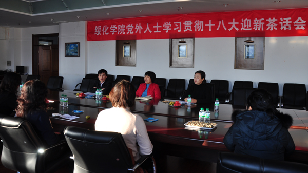 ,党委副书记董广芝组织召开党外代表人士学习贯彻十八大精神迎新茶话会。党委委员、党委宣传统战部长李淑慧,九三学社绥化学院支社、民进绥化学院支部、民革绥化学院支部、民建成员代表和无党派人士代表参加茶话会。茶话会由党委宣传统战部副部长刘鹏程主持。