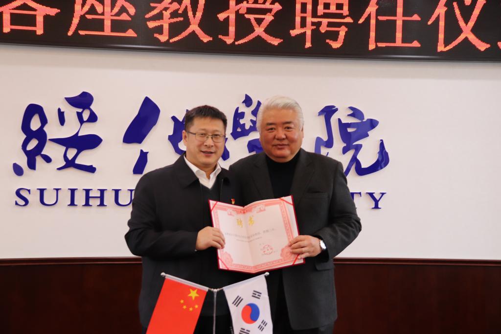 会上,还举行了特聘教授聘任仪式,聘请车大荣、金廷玟、李承春为我校客座教授。随后,访问团一行在艺术设计学院展厅进行了美术学科交流研讨会暨书画笔会,与我校教师交流切磋画技,并交换作品以作留念。