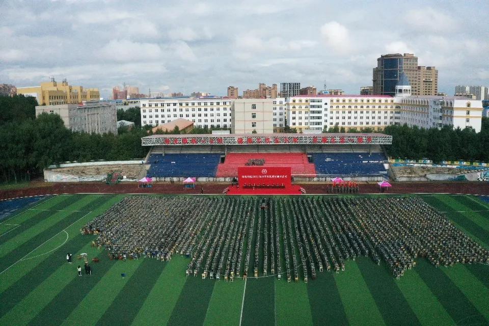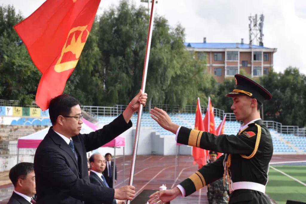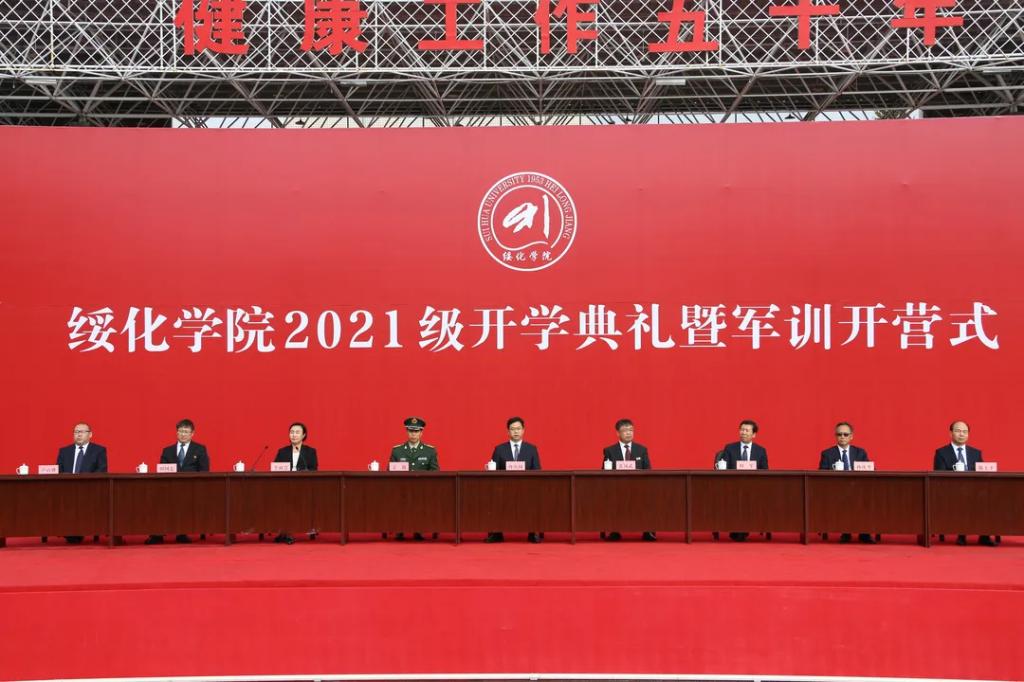 学校领导冉庆国、张凤武、田军、李淑慧、孙庆平、田国忠、陈玉平、卢百胜、武警绥化支队支队长丁锐出席开学典礼并为2021级军训团各营授营旗,各二级学院和相关职能部门领导以及武警绥化支队承担本次新生军训任务的全体教官和2021级全体新生共同参加开学典礼。