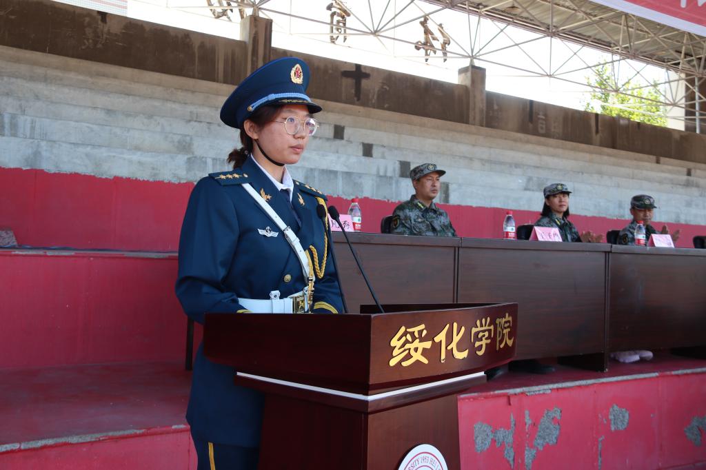 军训团九营学员、农业与水利工程学院付鑫琳同学代表优秀学员发言,她表示会把军人优良的生活和工作作风带到学习生活中,遵守纪律,努力学习,克服困难,取得佳绩。