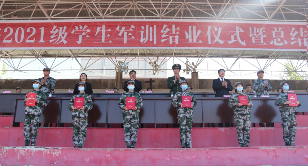 党委副书记、军训团政委李淑慧宣读了《关于表彰2021级学生军训优秀学员、优秀通讯员、优秀寝室、内务标兵的决定》。校领导为获奖集体和个人颁奖。