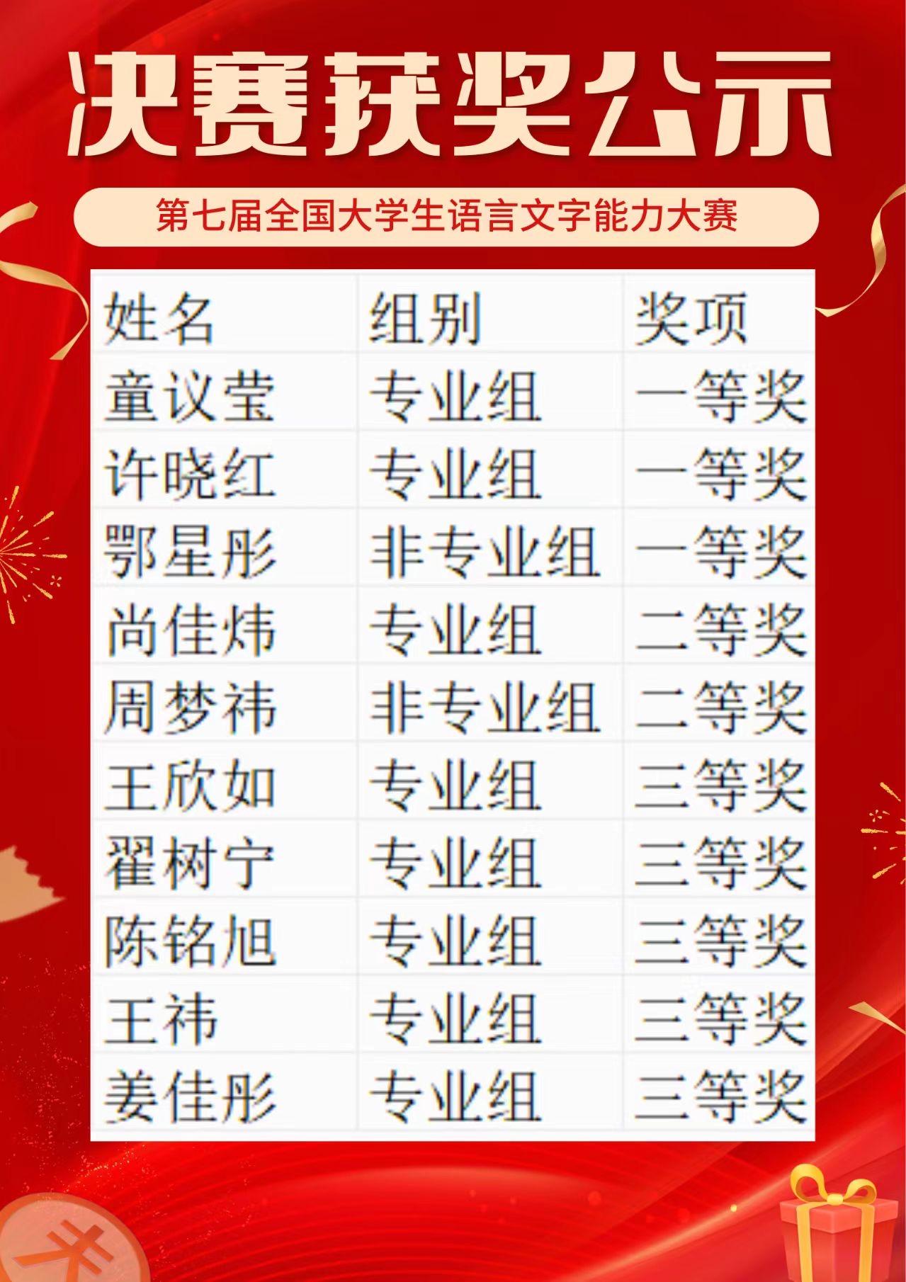 8月18日,第七届全国大学生语言文字能力大赛圆满落幕。我校学子凭借扎实的语言文字功底与出色的临场发挥,在决赛中表现优异,共荣获一等奖3项、二等奖2项、三等奖5项,创我校协办该项赛事以来的最佳成绩。