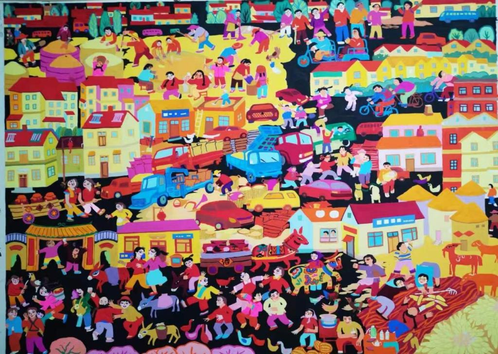 “黑龙江省农民画双年展”每两年一次,是我省美术界最具权威的评奖活动。艺术设计学院取得的这份成绩,彰显了教师队伍在农民画美术创作领域的专业高度与创新实力。高冰深耕艺术设计教学与创作十几年,功底深厚,富有激情。作品以黑龙江农民的生活和建筑为创作原型,突破传统写实桎梏,核心亮点在于精准捕捉乡村生活的“烟火气”,无论是田间劳作、庭院闲居还是节庆民俗,均以直白、真诚的视角还原乡土本真,没有刻意美化,却充满对土地与生活的热爱。构图多采用平面化、装饰性手法,不拘泥于透视规则,人物、景物的夸张变形,直观传递出丰收的喜悦与劳动的力量,符合民间审美中“求全、求满”的朴素愿望。这幅《斑驳乡韵》农民画以极具张力的民间视觉语言,将乡土生活的质朴与热烈展现得淋漓尽致。