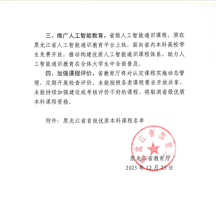 12月25日,黑龙江省教育厅公布了首批优质本科课程认定结果,我校《食用菌工厂化生产与管理》和《人工智能通识课程》两门课程成功入选。