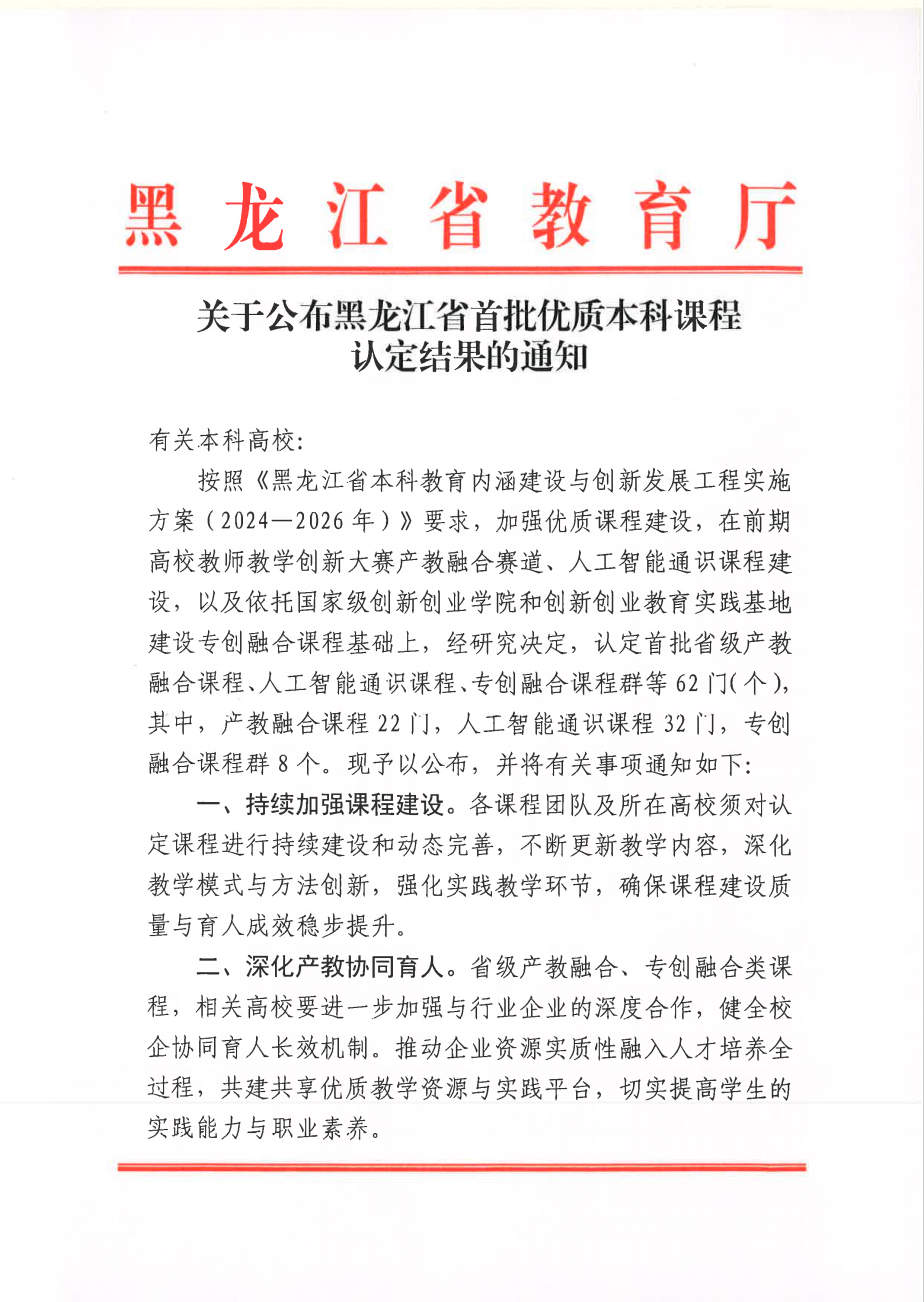 此次获批省级优质本科课程,是我校落实《黑龙江省本科教育内涵建设与创新发展工程实施方案(2024—2026年)》的重要阶段性成果,体现了学校在课程建设与教学质量提升方面的持续努力。近年来,学校高度重视本科教育内涵发展,系统推进课程改革与创新,着力打造具有高阶性、创新性与挑战度的一流课程。