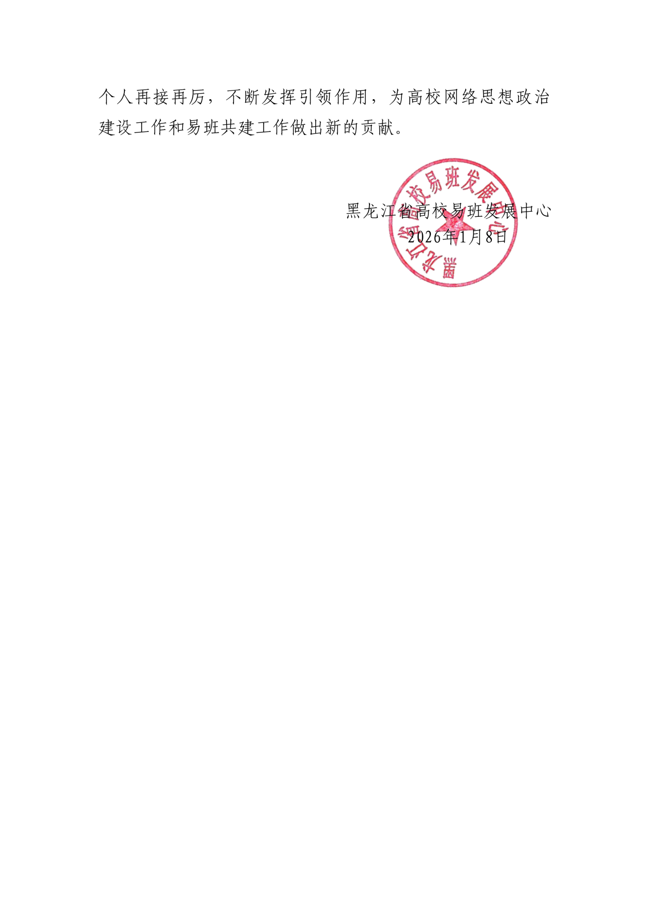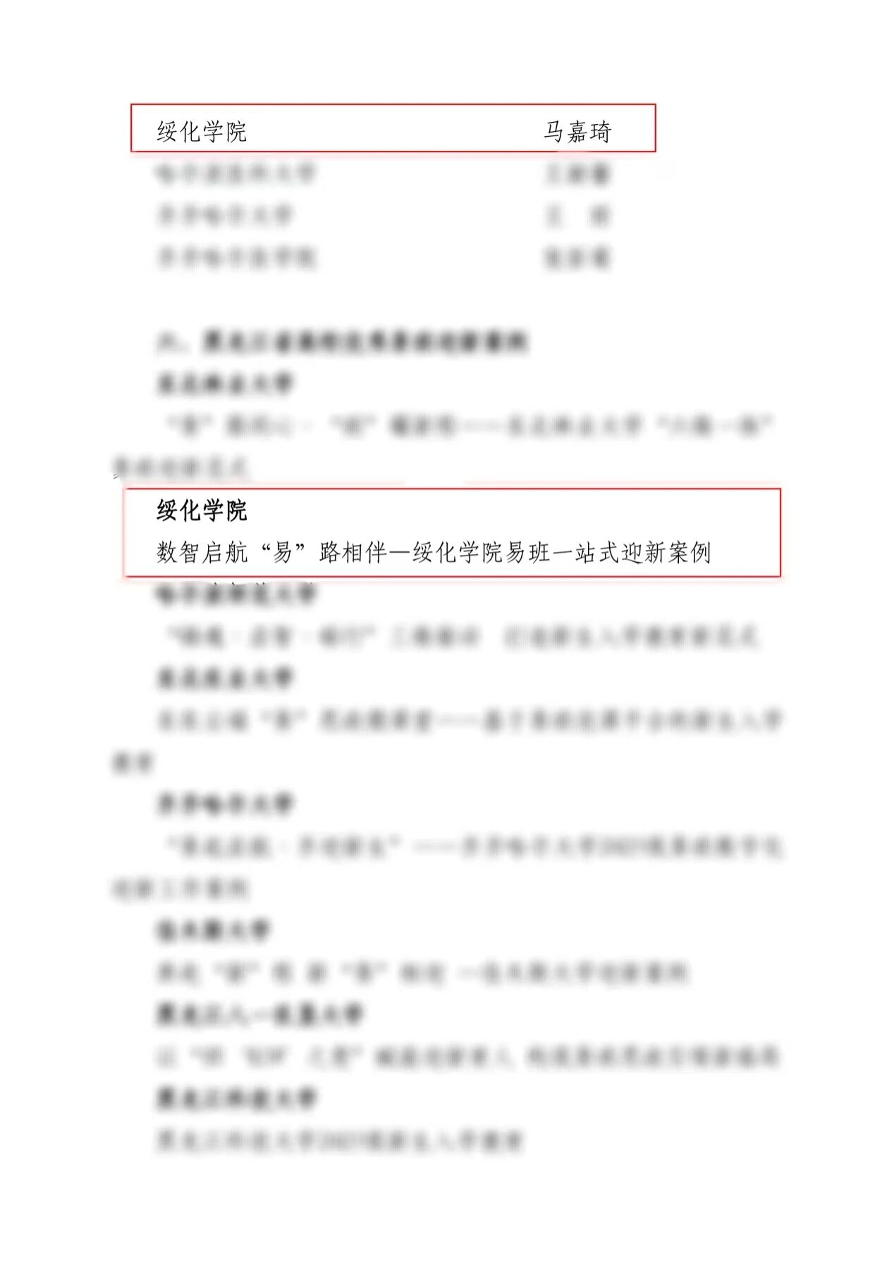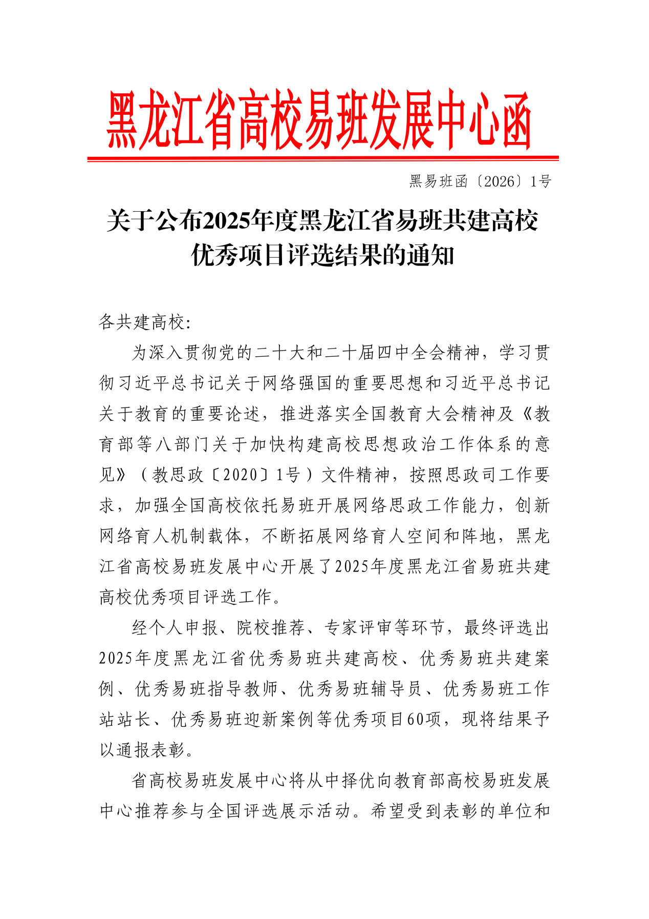 新年伊始,捷报再传。近日,黑龙江省高校易班发展中心印发《关于公布2025年度黑龙江省易班共建高校优秀项目评选结果的通知》,本次评选共有来自全省高校的60个优秀项目获奖,我校继上一年度再次实现全部6个优秀项目“大满贯”。其中,我校荣获“黑龙江省优秀易班共建校”、《“一牵引四融合”易班建设模式》荣获“黑龙江省高校优秀易班共建案例”、学生工作部陶立志和刘丹同志分别荣获“优秀易班指导教师”和“优秀易班辅导员”、音乐学院2023级学生马嘉琦荣获“优秀易班工作站站长”、我校《数智启航“易”路相伴—绥化学院易班一站式迎新案例》荣获“优秀易班迎新案例”。