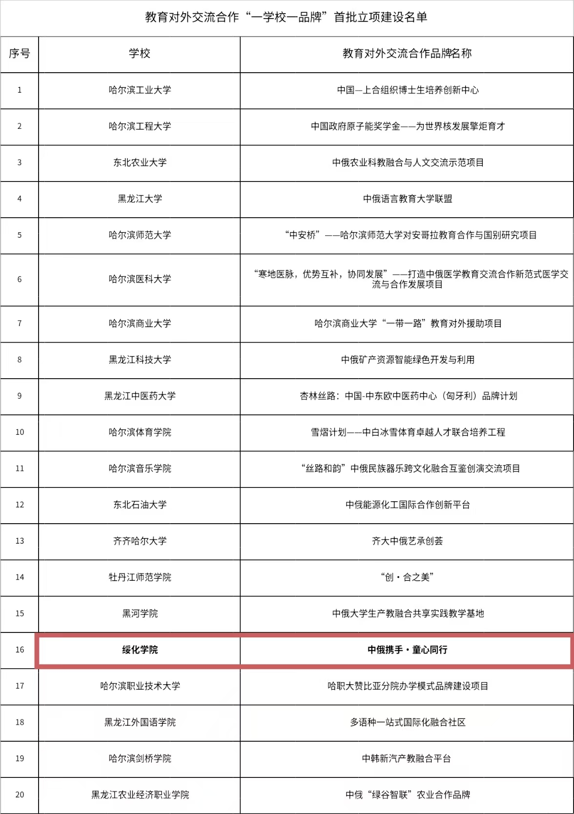 近日,黑龙江省教育厅发布了《关于教育对外交流合作“一学校一品牌”首批立项建设的通知》,公布了黑龙江省教育对外交流合作“一学校一品牌”首批20个立项建设名单。我校申报的“中俄携手·童心同行”项目成功入选。
