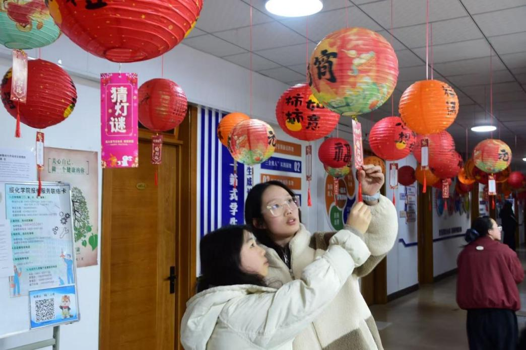 活动现场,涵盖传统文化等类别的灯谜卡片有序悬挂,同学们积极参与、踊跃竞猜,在破解谜题的过程中感受传统节日魅力。猜中者现场核验答案并领取奖品,现场氛围热烈而有序。