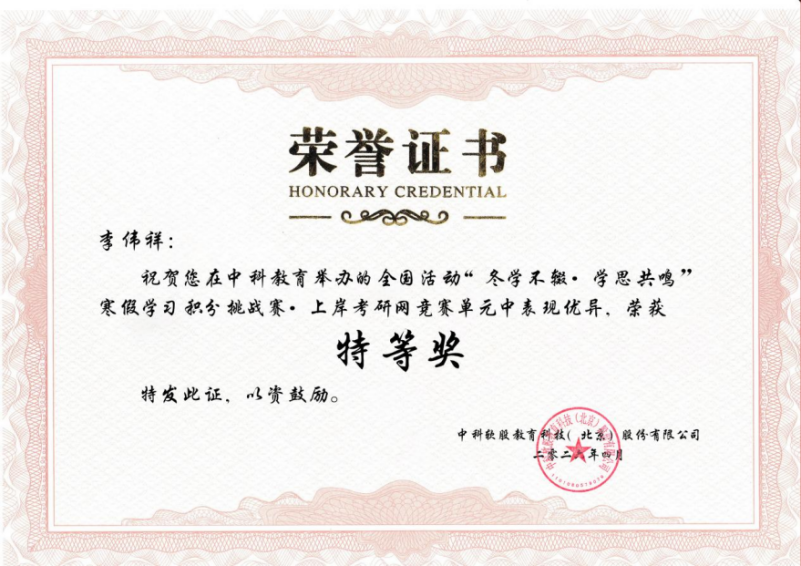 本次赛事覆盖全国众多高校,竞争异常激烈。比赛中,李伟祥同学不仅在上岸考研网参赛单元展现出超强的备考能力与知识储备,在中科考试库、专业课数据库两大参赛单元中也取得优异成绩,全方位彰显了我校学子优良的学习素养和自主学习能力。