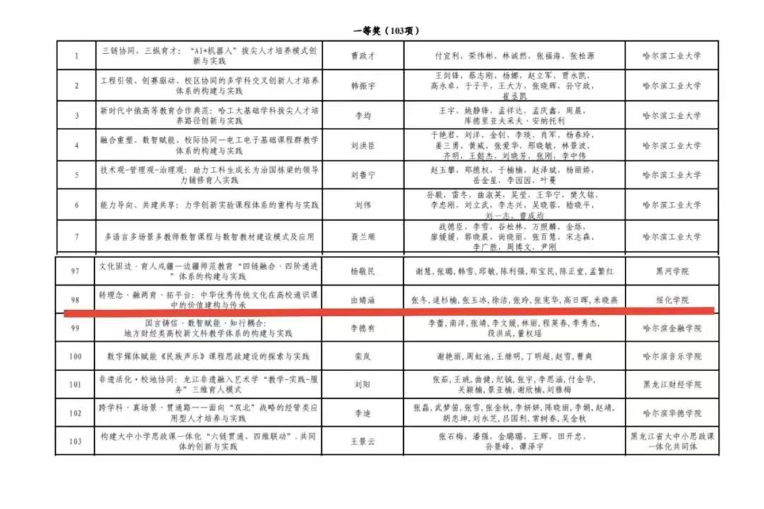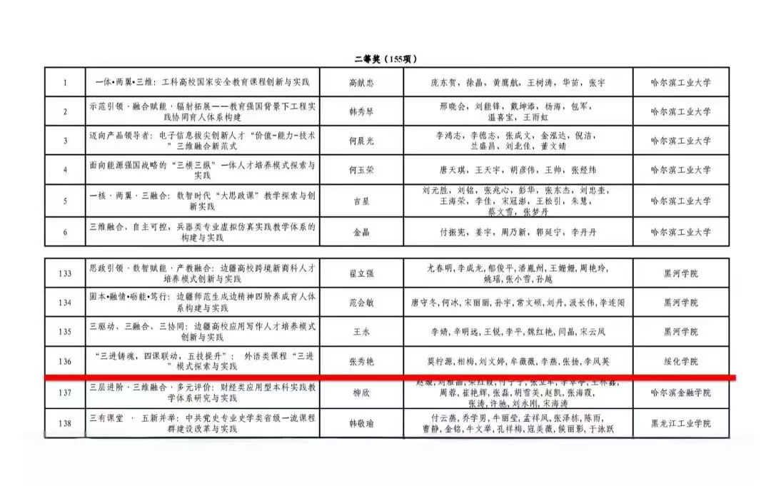 近日,黑龙江省教育厅公布了2025年黑龙江省高等教育教学成果奖获奖名单。我校教师由婧涵主持完成的《转理念·融两育·拓平台:中华优秀传统文化在高校通识课中的价值建构与传承》荣获省级教学成果一等奖;张秀艳主持完成的《“三进铸魂,四课联动,五技提升”:外语类课程“三进”模式探索与实践》荣获省级教学成果二等奖。