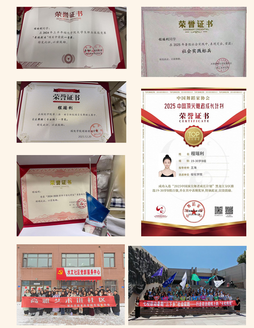 程瑶利,女,绥化学院音乐学院2023级舞蹈编导专业学生,班级团支书。曾获国家奖学金、校级综合奖学金;参与“七校边疆行”主题社会实践并获评“社会实践标兵”;多次参与社区文化志愿服务及公益演出,致力于以舞蹈服务社会、传递温暖。