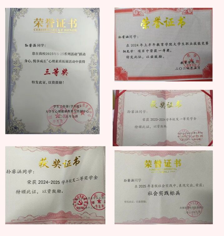 大学期间,她积极参加各类社会实践活动,努力将所学知识服务于社会。孙睿涵曾多次参与暑期“三下乡”社会实践活动,到农村为当地小学生开展课程辅导、兴趣拓展和心理疏导。她提到有一次为孩子们开设了“梦想课堂”,让他们写下自己的梦想并分享给大家。一个孩子写道:“我想当一名老师,像你一样,当太阳。也正是这件事,让她明白:教育的意义不只是传授知识,更是点燃一个孩子心里的光。“人不能只想当老师,更要因材施教地想当好老师。”