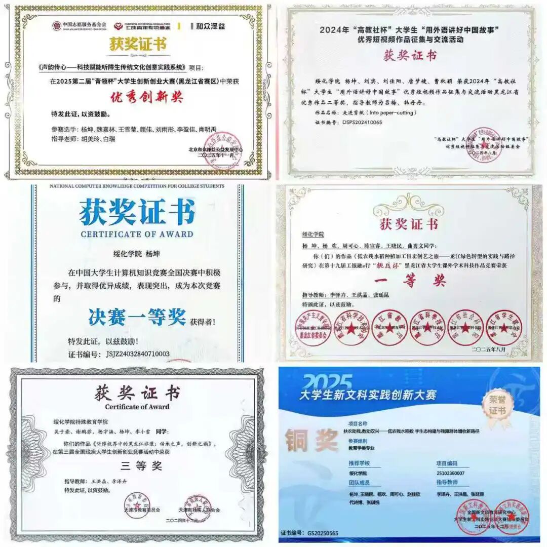 杨坤,男,汉族,2005年7月出生,中共预备党员,绥化学院特殊教育学院2023级特殊教育专业学生,现任特殊教育学院学生会主席。在校期间,他荣获国家励志奖学金、校级一等综合奖学金,并获评黑龙江省三好学生、十佳学习标兵、大学生年度创新创业人物、优秀共青团干部、社会实践标兵等荣誉称号。学术竞赛方面,他在黑龙江省第十九届工银融e行“挑战杯”全国大学生课外学术科技作品竞赛中荣获一等奖,在第二届大学生新文科实践创新大赛中斩获国赛铜奖及省赛二等奖等多项荣誉。